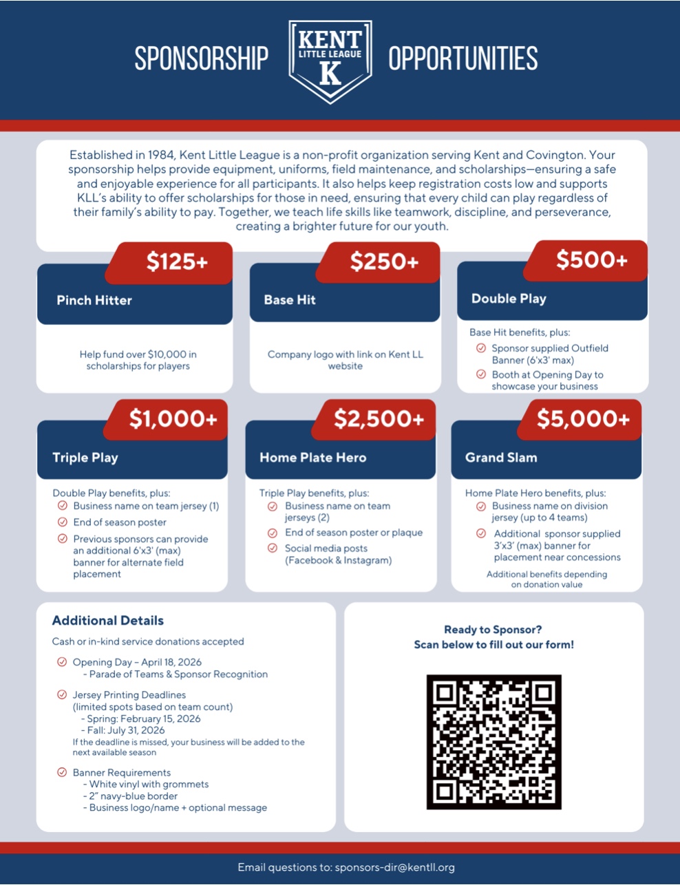 Kent Little League’s all volunteer organization generates revenue through fees, fundraisers, business & community support. If you can sponsor Kent Little League scan the barcode above. A donation receipt is available upon request.